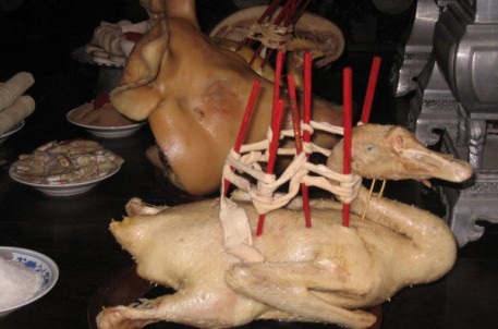 祝??偸窃谡龔d、堂前舉行。祭品叫福禮,擺福禮要用八仙桌。祭品多數(shù)是要煮熟的,惟有魚(yú)是活的,有的還得經(jīng)過(guò)精心處理。一般的人家用“三牲”福禮,即肉一方、魚(yú)一條、鵝一只??季恳稽c(diǎn)的則加上雞和牛肉(或羊肉),這叫“五牲”福禮。最講究而表示至誠(chéng)的則還有外加熊掌、羊肉的“七牲”福禮。雞、鵝要曲著身子,雙腿跪著放。在肉和雞、鵝之類(lèi)的祭品上,要橫七豎八地插上一些紅筷子,數(shù)目要成單,以七、九為宜。插上十根那是萬(wàn)萬(wàn)使不得的,據(jù)說(shuō)是因?yàn)槲餄M(mǎn)則仄,福神以為你家已稱(chēng)心如意了,那就不會(huì)再賜福給你,而且弄不好還會(huì)降災(zāi)惹禍。祭品中的魚(yú)是鮮活的,整條地放在朱漆桶盤(pán)上,在眼睛上貼上一張紅紙,講究點(diǎn)的是用紅紙剪出的“?!弊?。