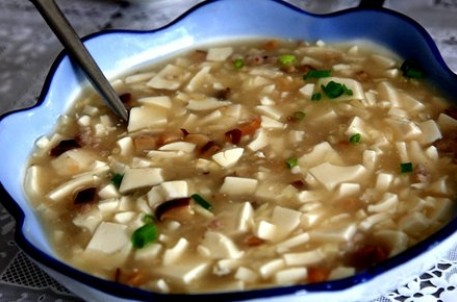 取質(zhì)量上乘的豆腐適量,切成小塊或丁粒。豆腐以清水煮開,去原水以除豆腥,再加雞湯適量,同時將香菇、火腿、嫩筍、開洋或其它適合口味的作料切成丁,放入鍋中一起煮沸后,再加適當(dāng)調(diào)料并勾芡,最后佐以蛋黃汁和青蔥即成。