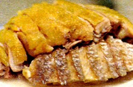 “白鲞扣雞”是紹興民間的傳統(tǒng)佳肴?!鞍做摺保从么簏S魚加工制成的咸干品,味鮮美、肉結(jié)實,為名貴海產(chǎn)品,中醫(yī)認為其味甘、性平,可開胃、消食、健脾、補虛?!霸诫u”,為紹興歷史貢品、名特產(chǎn),鮮嫩肥美,中醫(yī)認為其味甘、性溫,可溫中益氣、補精添髓,白鲞與越雞配伍,同蒸成肴,可謂錦上添花,其味更勝一籌,兩物均具滋補之功,加之新鮮,咸鮮互補,兩味滲合,雞有鲞香,鲞有雞鮮,咸鮮入味,香醇清口,富有回味,不愧為肴中之珍品,紹興“咸鮮合一”風(fēng)味的典型代表。