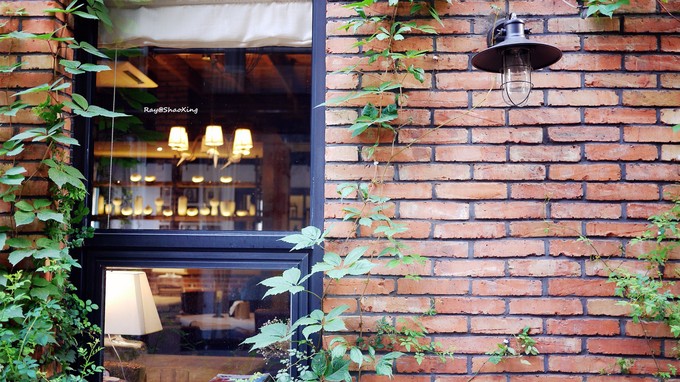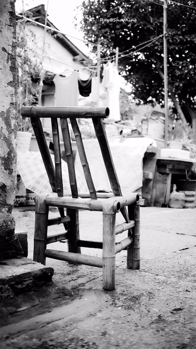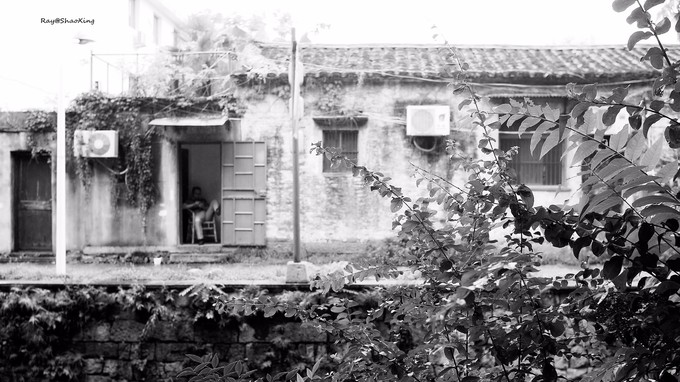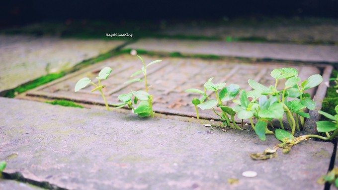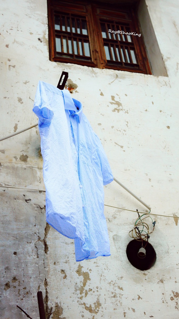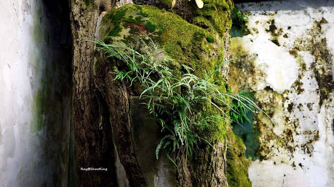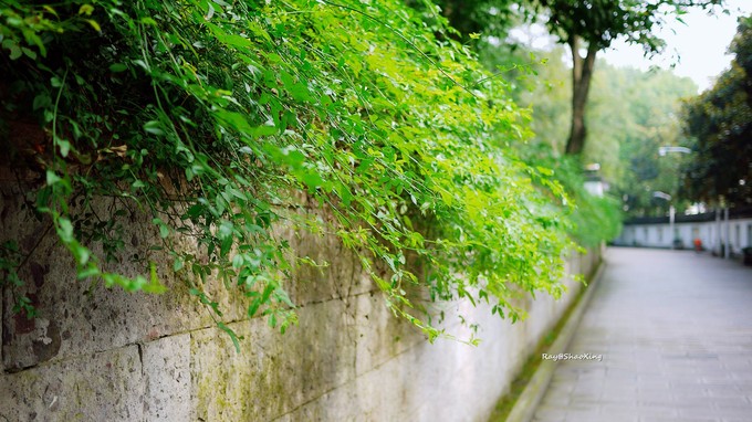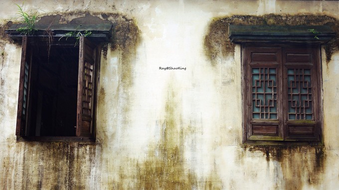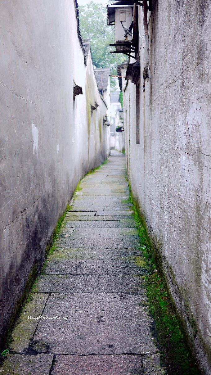 看對(duì)面斑駁的墻 被雨水淋濕的地方呈現(xiàn)出一條一條的深綠色