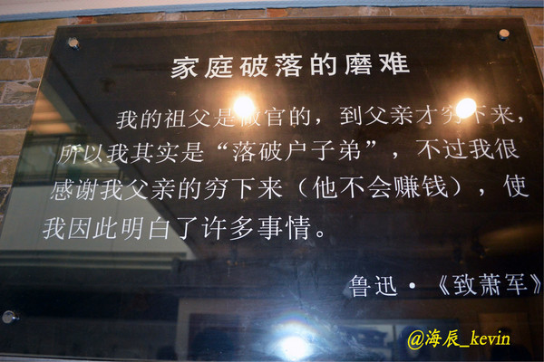 對(duì)于魯迅一人,并沒(méi)有太多的了解,在去紹興之前看了一部關(guān)于魯迅先生的紀(jì)錄片,推薦給各位,對(duì)于短時(shí)間內(nèi)了解魯迅還是很有幫助的。http://www.tudou.com/listplay/47FkV9i5NzU.html。其實(shí)在看過(guò)魯迅的生平之后,對(duì)于魯迅棄醫(yī)從文的一段并未有太大觸動(dòng),這是一個(gè)主旋律的故事。我更感興趣的是魯迅的個(gè)人生活,他的感情世界。對(duì)于他這樣一位國(guó)人眼中極為嚴(yán)肅的人,在25歲奉母之命完婚,對(duì)方名為朱安,人稱安姑,當(dāng)天晚上魯迅徹夜未眠,后來(lái)的兩個(gè)晚上都是睡在母親房中,第四天便與朋友東渡日本。魯迅提到朱安時(shí),說(shuō)“這是母親給我的一件禮物,我只能好好地供養(yǎng)它,愛(ài)情是我所不知道的”。后來(lái)魯迅與學(xué)生許廣平相戀并同居,朱安卻依然本分的替魯迅照顧其母直到其母病逝。最終朱安去世的時(shí)候,身邊沒(méi)有一個(gè)人。朱安生前對(duì)人講:“周先生對(duì)我不壞,彼此間并沒(méi)有爭(zhēng)吵”。