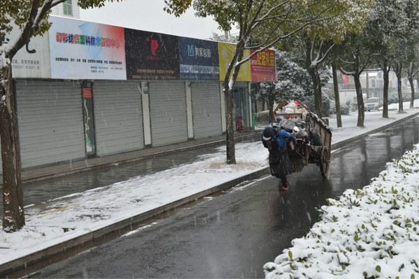 由于擔(dān)心158也會(huì)沒(méi)有車,思量再三,決定在這一站繼續(xù)等118。雪愈下愈大,可是車卻遲遲不現(xiàn)身。在等車的過(guò)程中,看到了她,一個(gè)很辛苦的環(huán)衛(wèi)工人,這樣惡劣的天氣,她拉著車吃力的在雪中前行,當(dāng)看到我的鏡頭對(duì)準(zhǔn)她的時(shí)候,她把頭低了下去。我不知道,是不是我的舉動(dòng)刺傷了她的自尊。我想起了前段時(shí)間央視記者問(wèn)一位撿垃圾的老人"你幸福嗎",也許我們不懂,這樣的行為其實(shí)傷害了他們。