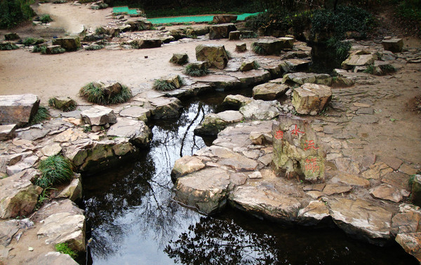 彎彎曲曲的流水,當(dāng)時(shí)文人們齊坐在河水兩邊,扔一個(gè)酒葫蘆在水里漂,漂到誰面前,誰就要飲酒作詩,這便是著名的“曲水流觴”。