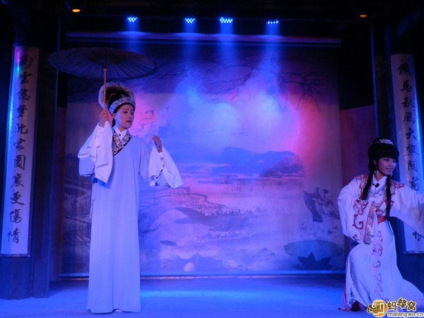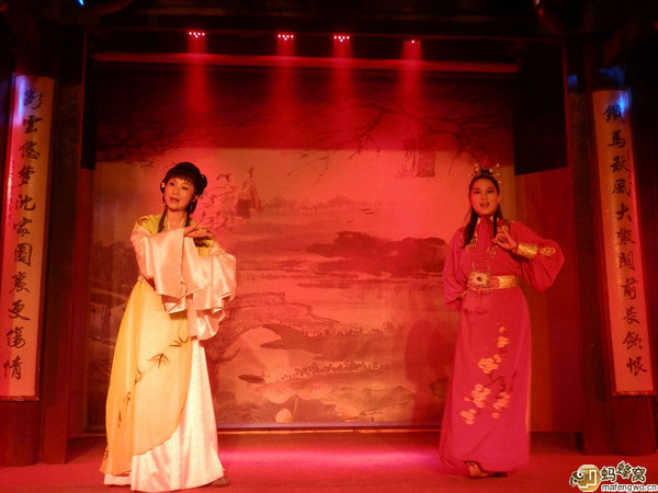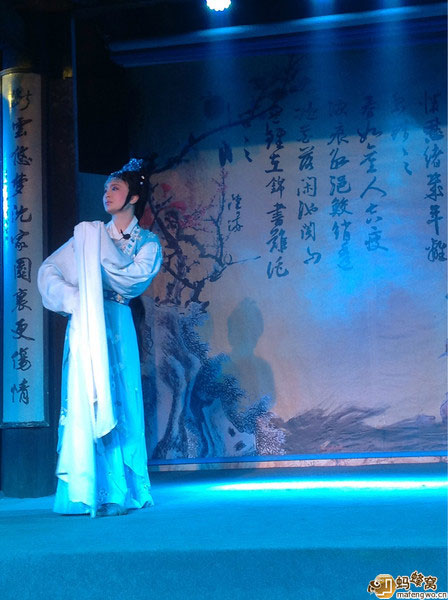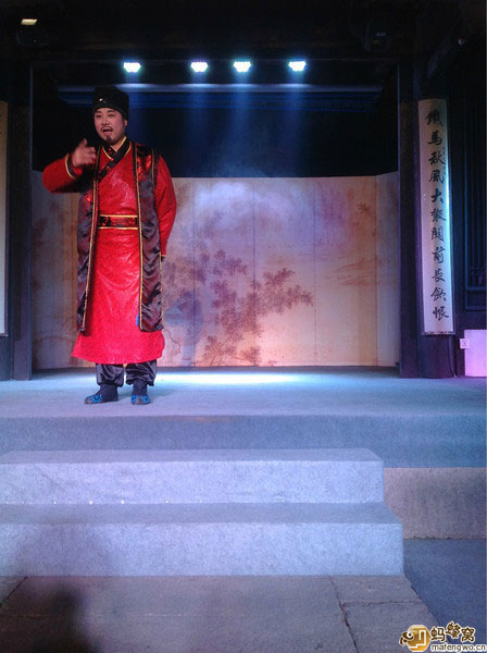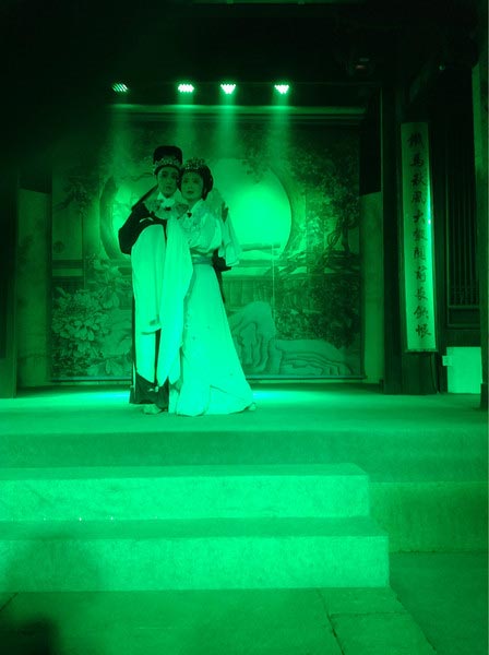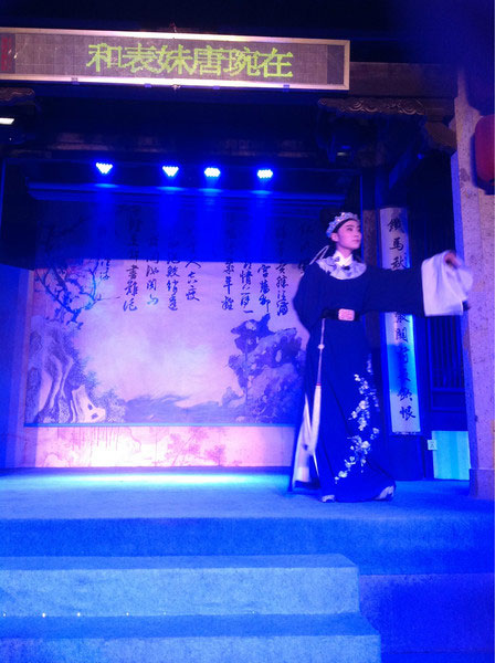 白天參觀魯迅故里,晚上到沈園欣賞堂會 ——《沈園之夜》。節(jié)目以陸游和唐婉離婚后又在沈園的相遇為開場,后面穿插了梁祝,白蛇傳,紅樓夢,天仙配等幾段折子戲。唱腔運用的是越劇中的不同曲調(diào)、黃梅戲,還有改編過的流行歌曲,古今合璧。串場的管家精彩幽默的表演是讓整場演出高潮迭起的亮點。
