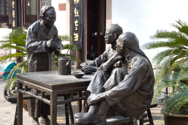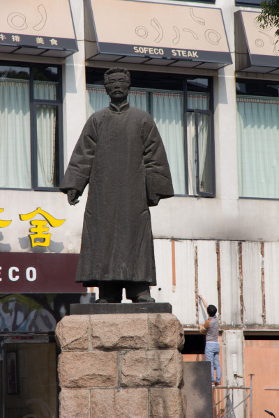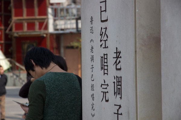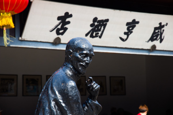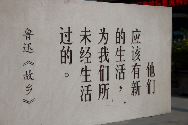 吃完飯,往青藤書屋逛去,路過咸亨新天地,其實(shí)也就是一些魯迅作品中的話做成的一個(gè)石柱,還有一尊魯迅的雕塑。