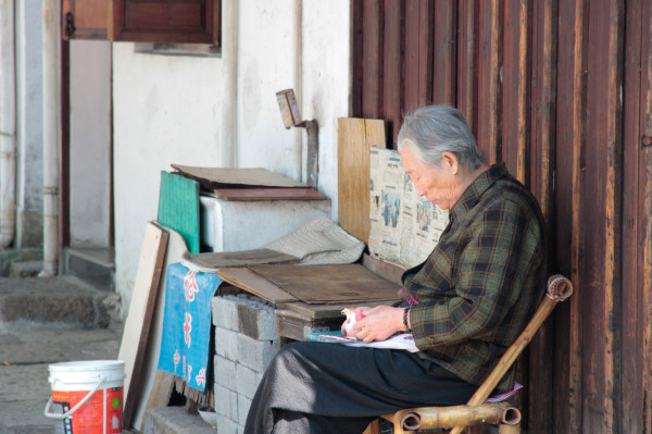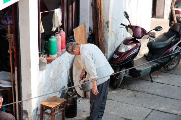 看到了一戶人家,老爺爺正在生煤球爐,煙一陣陣地冒出來,嗆得眼睛流出眼淚,在煙霧迷蒙中,似乎回到了我的小時(shí)候,每天放學(xué)后看媽媽生煤球爐,然后在上面做飯;而那些煤球屑屑,積少成多后又會(huì)兌上水,和勻之后一坨坨地放在太陽下曬干,下次又可以再用。這樣的日子早已遠(yuǎn)離了我們,說不上一種生活的好壞,只是時(shí)間一直往前留下的一些痕跡而已。