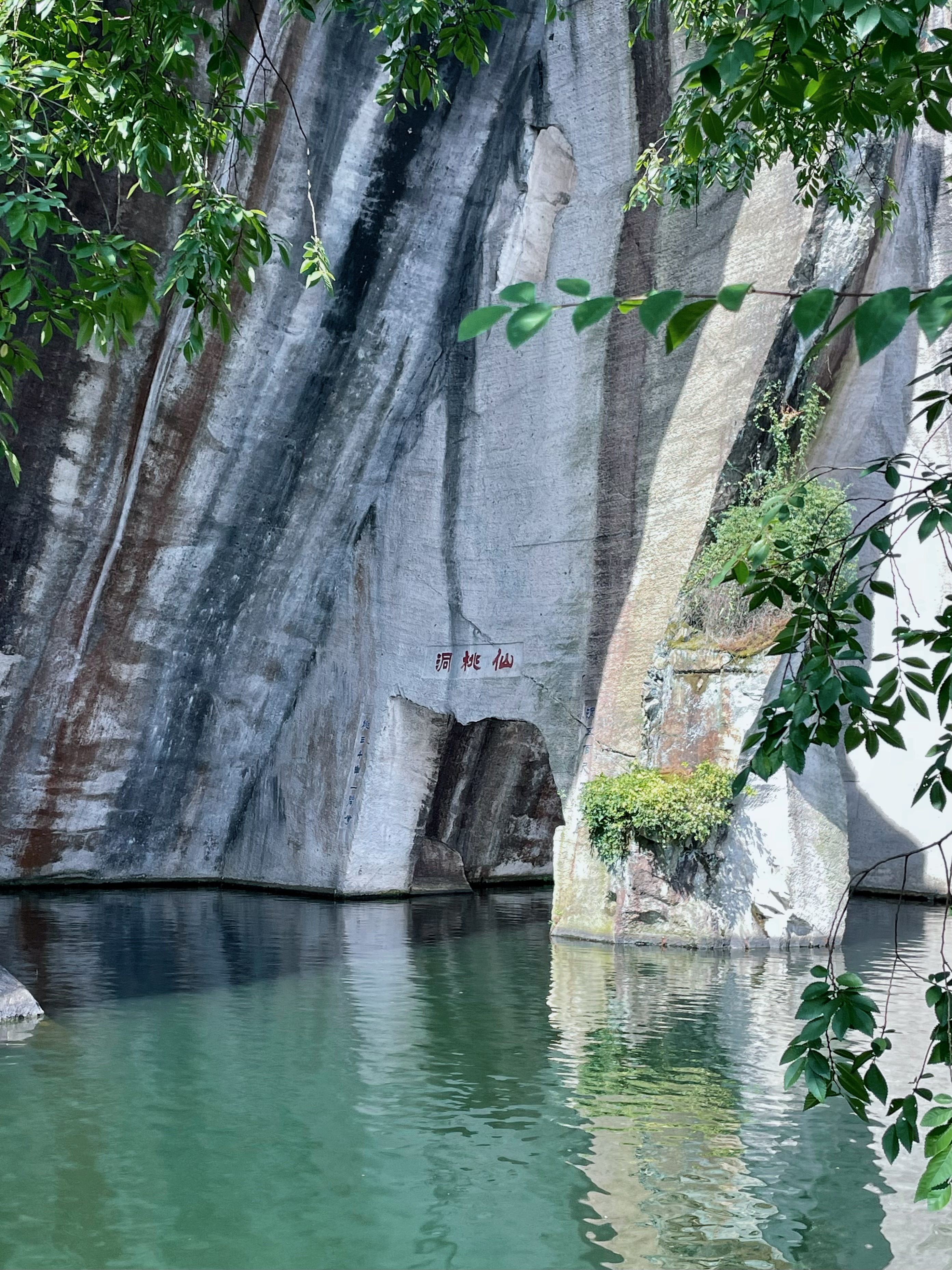 東湖的采石遺跡別具特色,有三洞最為神奇。三洞之一“仙桃洞”因洞穴形似半個桃子、山石色澤粉紅而得名。洞穴位于石壁之間,是工匠們采石遺留的痕跡,雖鑿自人工卻宛若天開。此洞在山中,洞能通船,洞中有門,十分神奇,厚度不到1尺的石壁中間竟鑿有一扇寬約兩米的石門,它呈90度懸掛在山崖邊,最薄處厚度僅有10厘米。石門貫通了兩個原本不相連的石洞,使得湖洞相連,烏篷船可以從容穿梭于石門間。